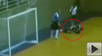 實拍:一室內(nèi)足球隊員滑倒被地板碎片