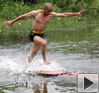 獨竹漂又被稱為“水上芭蕾”。記者在表演現(xiàn)場看到,隊員將長7.5米,寬15厘米的的獨舟放入水中,然后腳踩獨舟,手執(zhí)4.5米的劃桿,悠閑地在湖面上做起了各種高難度動作:一會兒隊員們做著俯臥撐、一會兒又表演金雞獨立和隊列變換,引來岸邊觀眾的不斷喝彩。(表演隊員):人在江湖漂,哪能不挨刀,為啥不挨刀,咱會獨竹漂….