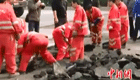 【解說】事發(fā)后,當(dāng)?shù)毓、消防、國土資源、安監(jiān)、醫(yī)療救護(hù)等相關(guān)部門先后趕到現(xiàn)場救援。山體滑坡處位于采石場一側(cè)角落,數(shù)十塊巨石滑落,大型機(jī)械無法靠近,施救難度很大,F(xiàn)場一輛挖掘機(jī)正在挖掘?qū)ふ沂鹿と,直到下?點(diǎn)40左右,在半山腰的一塊巨石下面發(fā)現(xiàn)了一名男子。