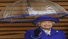 英國(guó)女王愛(ài)打扮,衣帽胸花雨傘要配套。