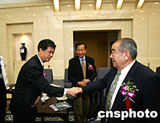 中國新聞社總編輯郭招金和九屆全國人大副委員長布赫親切握手
