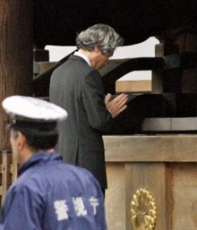 | 10月17日,日相小泉無(wú)視亞洲各國(guó)的強(qiáng)烈反對(duì)再次參拜供奉有二戰(zhàn)日本甲級(jí)戰(zhàn)犯的靖國(guó)神社。對(duì)此,中國(guó)外交部發(fā)表聲明,嚴(yán)厲譴責(zé)小泉“拜鬼”。中國(guó)駐日本大使王毅也在東京緊急約見(jiàn)日本外相町村信孝,向日方提出強(qiáng)烈抗議。 |