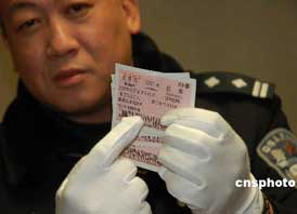 假票主要有“回頭票”、“補(bǔ)、涂改票”、“整版假票”三種;仡^票一般票面較舊,且已被剪口;補(bǔ)、涂改票由于刮掉了一部分纖維,顏色會有些發(fā)白,整個票面顏色不統(tǒng)一;而假票票面“中國鐵路”標(biāo)志以及背面的水印較為模糊,用手輕揉票面文字及數(shù)字時,油墨即會沾在手上。