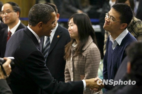 圖:美國總統(tǒng)奧巴馬與中國青年握手問候