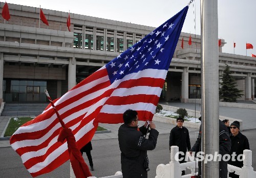 圖:中美國旗飄揚(yáng)歡迎奧巴馬訪華
