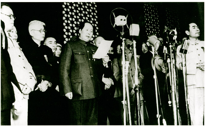 下午3時(shí),首都30萬軍民齊聚天安門廣場,舉行開國大典。毛澤東宣讀了《中華人民共和國中央人民政府公告》,升起了莊嚴(yán)的國旗。朱德宣讀了中國人民解放軍總部命令,命令人民解放軍迅速肅清國民黨一切殘余武裝,解放一切尚未解放的國土,同時(shí)肅清土匪和其他一切反革命匪徒,鎮(zhèn)壓他們的一切反抗和搗亂行為。接著,舉行了閱兵式。中華人民共和國的成立,標(biāo)志著帝國主義、封建主義和官僚資本主義對中國人民反動統(tǒng)治的徹底結(jié)束。中國人民從此成為中國社會的真正主人。中國從此由半殖民地半封建社會開始進(jìn)入新民主主義社會,并向社會主義社會過渡。
