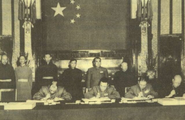 中央人民政府全權(quán)代表和西藏地方政府全權(quán)代表經(jīng)過(guò)談判之后,對(duì)和平解放西藏取得了一致的意見(jiàn)。一九五一年五月二十三日,《中央人民政府與西藏地方政府關(guān)于和平解放西藏辦法的協(xié)議》在北京正式簽訂。簽字儀式由中央人民政府副主席朱德、李濟(jì)深,中央人民政府政務(wù)院副總理陳云主持。