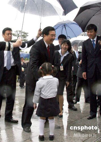 圖:胡錦濤主席在雨中接受日本小姑娘的獻(xiàn)花