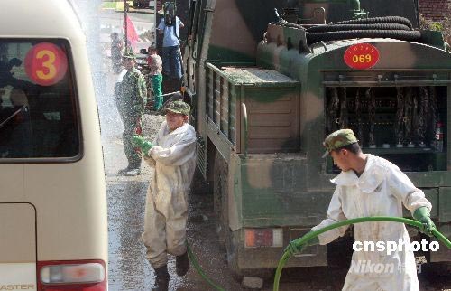 圖:北川災(zāi)區(qū)為進(jìn)出車輛實(shí)行嚴(yán)格消毒