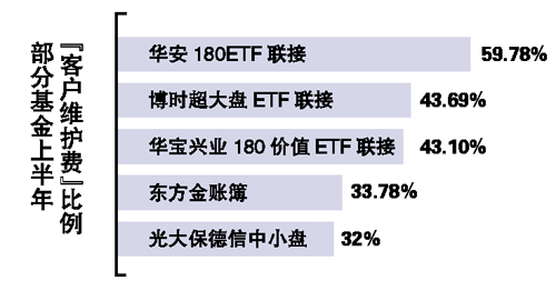 具體來看,18家已公布半年報(bào)的基金管理公司,上半年平均向渠道支出了13.76%的管理費(fèi)用于“客戶維護(hù)”。其中,支出“客戶維護(hù)費(fèi)”占其管理費(fèi)收入最高的三家公司,分別為長信基金、東方基金、光大保德信基金,三家公司各自支出了自身管理費(fèi)的23.61%、22.25%、20.98%用于“客戶維護(hù)”。而從單個(gè)基金出發(fā),這個(gè)數(shù)據(jù)則更為驚人。整體來說,業(yè)內(nèi)最高三至五成的費(fèi)用支出比例仍然讓人咋舌。