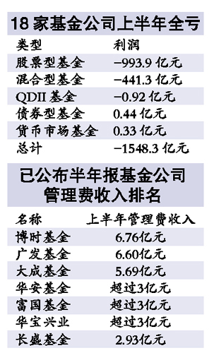 18家基金公司旗下234只基金的半年報(bào)面世,基金業(yè)利益鏈昭然若揭:今年上半年,已披露半年報(bào)的基金共計(jì)虧掉基民1548億元,但基金公司管理費(fèi)收入不減反增,半年大賺51.13億元, 比去年同期多收了16.01%;基金銷售渠道更是坐收漁利,上述基金上半年共計(jì)支出客戶管理費(fèi)高達(dá)7.04億元,同比增長了13.28%。