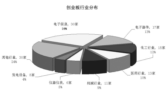 行業(yè)上看,創(chuàng)業(yè)板股共涉及23個行業(yè),其中電子信息股30只,占總數(shù)的24%,穩(wěn)居榜首;電子器件則有17只個股,占比13%緊隨其后。若加上儀器儀表、發(fā)電設備的11只個股,則泛電子類品種占創(chuàng)業(yè)板的比重將超過45%,今年4月30日上市的第11批創(chuàng)業(yè)板股,更全屬該行業(yè),顯示出其于國家大力扶持新興產(chǎn)業(yè)中的龍頭氣質(zhì)。同時,醫(yī)藥、化工、機械等行業(yè)亦有10家以上的創(chuàng)業(yè)板股;傳媒娛樂、環(huán)保行業(yè)則分別貢獻4只和3只個股。(圖2)