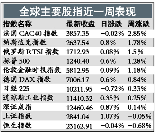 雖然中國A股近期萎靡不振,但其他多數(shù)股指表現(xiàn)搶眼,其中,受利好數(shù)據(jù)提振,美國道瓊斯指數(shù)上周五報收11410.32點,上漲0.35%,且已經實現(xiàn)連續(xù)兩周走高。其中,納斯達克收盤創(chuàng)下2007年12月以來的新高。而法國股市更是以2.85%的單周漲幅領漲全球股市。