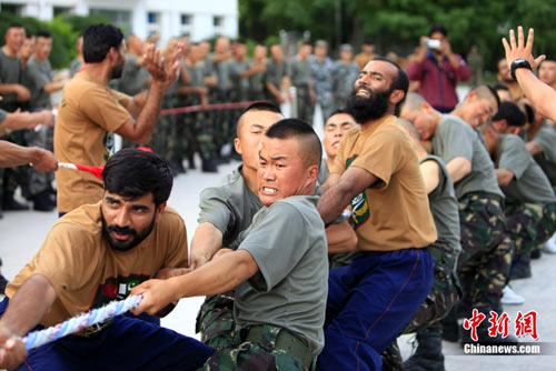 7月初,代號(hào)“友誼—2010”的中國巴基斯坦反恐聯(lián)合訓(xùn)練在中國寧夏青銅峽地區(qū)展開,此次訓(xùn)練主要以邊境地區(qū)山地聯(lián)合反恐作戰(zhàn)為課題。開訓(xùn)以來,參訓(xùn)官兵每天不論是訓(xùn)練交流還是開展文體活動(dòng),都混編為A連和B連為單位組織實(shí)施,盡管語言溝通并不暢通,但中巴兩國士兵在手勢(shì)和眼神的幫助下,依然能夠協(xié)作訓(xùn)練默契自然,完成動(dòng)作標(biāo)準(zhǔn)規(guī)范。中新社發(fā) 杜洋 攝