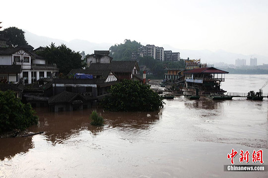 7月19日,今年入汛以來最大洪峰經(jīng)過重慶主城,長江、嘉陵江水位上漲。記者在重慶古鎮(zhèn)磁器口看到,從磁器口江邊至磁器口街道的梯坎已“隱”于水面下,標志性牌匾龍隱門沒至“腰部”,靠近江邊的商鋪及民居被淹。目前,大部分商家、市民接預警已提前撤場歇業(yè)或撤離至安全地帶。截至記者趕赴磁器口途中,部分必經(jīng)路段已實施交通管制,磁器口正街漲水期間亦采取禁行措施。據(jù)長江水利委員會水文局監(jiān)測數(shù)據(jù),19日20時長江重慶寸灘站水位超過185米,這是重慶遭遇的長江今年以來最大洪峰。截至20日0時,長江重慶水位仍在185.06米的峰值上流動,洪峰仍在過境重慶。 劉函冉 攝