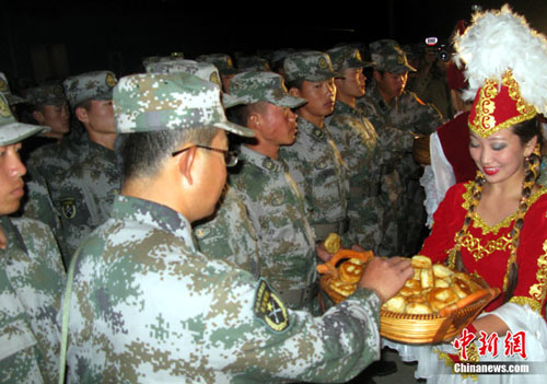 當(dāng)?shù)貢r(shí)間9月7日凌晨,中國(guó)人民解放軍參加“和平使命-2010”上海合作組織聯(lián)合反恐軍事演習(xí)陸軍戰(zhàn)斗群第一列車(chē)梯隊(duì)參演官兵及裝備,順利抵達(dá)臨近演習(xí)現(xiàn)地的哈薩克斯坦奧塔爾市火車(chē)站。中新社記者 孫自法攝