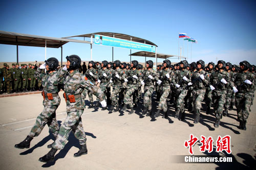 9月24日,“和平使命-2010”上海合作組織成員國(guó)武裝力量聯(lián)合反恐軍事演習(xí)戰(zhàn)役實(shí)施階段實(shí)兵演練,演練在哈薩克斯坦南部馬特布拉克訓(xùn)練場(chǎng)正式舉行。當(dāng)天下午在野戰(zhàn)兵營(yíng)為聯(lián)演中表現(xiàn)優(yōu)異的各方軍官和士兵代表舉行頒獎(jiǎng)儀式,圖為中方參演部隊(duì)官兵分列式走過(guò)儀式主席臺(tái)。