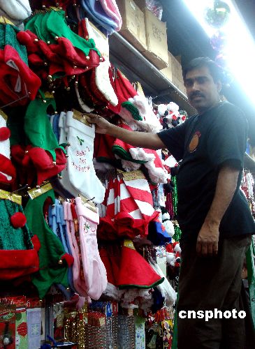圣誕節(jié)臨近,中國(guó)制造的節(jié)日飾品在紐約陸續(xù)登場(chǎng)。圖為位于紐約曼哈頓中城一家商店的店員忙于上貨,這位店員表示,這些飾品都是中國(guó)制造。中新社發(fā) 譚宏偉 攝