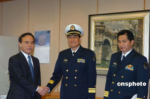 11月29日上午,正在日本進行正式友好訪問的中國海軍軍艦訪日團指揮員肖新年少將一行來到日本防務省,與日本軍界進行交流活動。圖為肖新年少將(中)與日本防務省遷優(yōu)參事官(左)握手,訪日中國海軍導彈驅(qū)逐艦“深圳號”艦長朱建達上校(右)陪同會見。中新社發(fā) 滕劍峰 攝