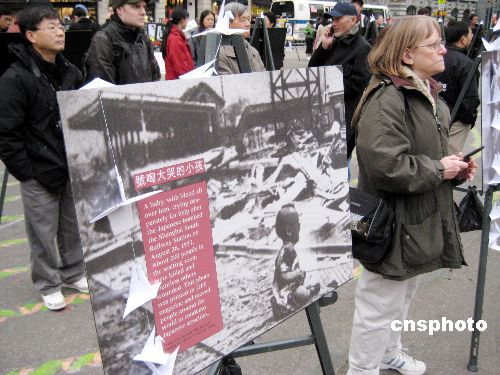 十二月九日下午,由紐約地區(qū)留學生、專家學者以及當?shù)厝A人團體聯(lián)合舉辦的南京大屠殺七十周年紐約紀念集會,在曼哈頓著名的聯(lián)合廣場舉行。紀念活動展示大量史料圖片展板,悼念大屠殺中遇難與受難的同胞,當?shù)厝A人和紐約民眾重溫這段歷史真相;顒又,現(xiàn)場演講與觀眾簽名抗議日本當局少數(shù)右翼分子否認和淡化這段慘絕人寰的侵略歷史。中新社發(fā) 鄧悅 攝