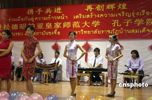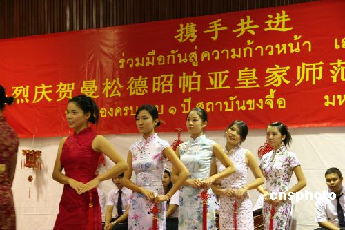 泰國(guó)曼松德昭帕亞皇家?guī)煼洞髮W(xué)孔子學(xué)院十九日在該校隆重舉行孔子學(xué)院成立周年慶典活動(dòng),慶典儀式后泰中兩國(guó)學(xué)生以“多元文化的融合,和諧世界的構(gòu)建”為主題共同表演了一場(chǎng)精彩的文藝演出,圖為泰中兩國(guó)學(xué)生的旗袍服裝表演。中新社發(fā) 顧時(shí)宏 攝