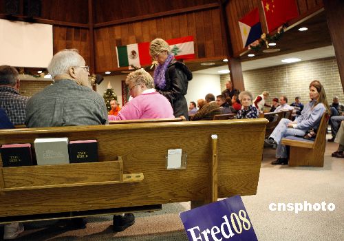 美國艾奧瓦州當(dāng)?shù)貢r(shí)間1月3日舉行美國2008總統(tǒng)大選的首場初選。圖為艾奧瓦中部小鎮(zhèn)厄本代爾的一個(gè)共和黨選區(qū)現(xiàn)場。共和黨人赫卡比在當(dāng)晚選舉中勝出。中新社發(fā) 李靜 攝