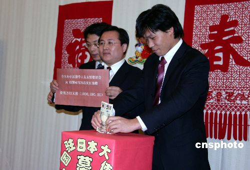 2月4日晚,中國(guó)駐日大使館舉行2008年春節(jié)聯(lián)歡會(huì)前,專門舉行了向國(guó)內(nèi)雨雪災(zāi)區(qū)進(jìn)行捐款的活動(dòng)。中新社發(fā) 滕劍峰 攝