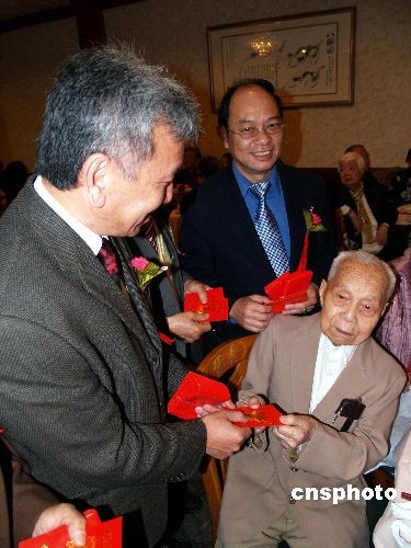 圖為中華會館主席伍競群等僑領特向101歲的老人周榮福發(fā)紅包。
