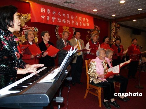 2月14日,適逢情人節(jié),美國洛杉機中國城國泰老人大廈300多位華人耆老歡聚聯(lián)歡,這些年均年齡80歲的老人們現(xiàn)場唱起了“青春之歌”。中新社發(fā) 盧威 攝