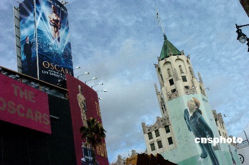 美國(guó)第八十屆電影奧斯卡頒獎(jiǎng)典禮即將于二月二十四日傍晚舉行,洛杉磯好萊塢星光大道上高豎巨型廣告,希望招攬觀眾人氣。中新社發(fā) 賈國(guó)榮 攝