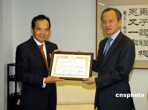 3月6日下午,日本零售業(yè)巨頭之一永旺集團(tuán)董事長兼總經(jīng)理岡田元也來到中國駐日大使館,委托使館向中國臥龍熊貓基地捐款2500萬日元。圖為接受捐款后,中國駐日大使崔天凱(右)向?qū)镌?左)頒發(fā)獎狀。中新社發(fā) 滕劍峰 攝