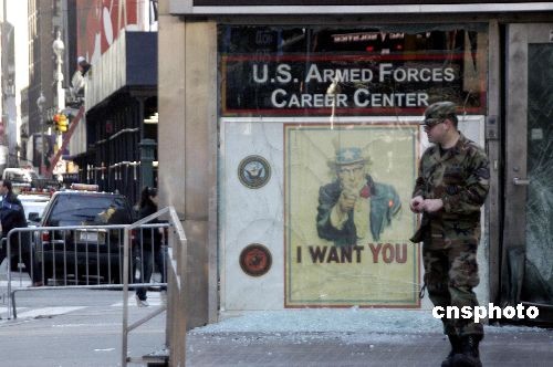 3月6日凌晨3時(shí)45分左右,紐約時(shí)代廣場一征兵點(diǎn)門口發(fā)生爆炸,但沒有造成人員傷亡。紐約警方稱,事發(fā)當(dāng)時(shí)該征兵點(diǎn)無人駐守,爆炸僅造成該征兵點(diǎn)門窗破損,目前相關(guān)調(diào)查正在進(jìn)行當(dāng)中。中新社發(fā) 譚宏偉 攝