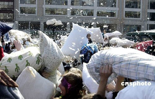 3月22日,紐約數(shù)百名青年聚居在曼哈頓聯(lián)合廣場(chǎng)展開一年一度的枕頭大戰(zhàn)。大家用睡了一個(gè)冬天的枕頭將彼此“砸醒”,笑迎春天的到來(lái)。中新社發(fā) 鄧悅 攝