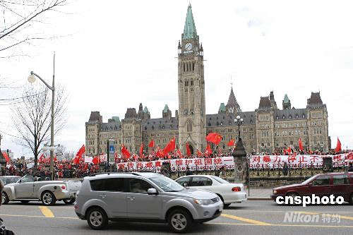當(dāng)?shù)貢r(shí)間4月13日下午,近萬(wàn)名來(lái)自加拿大各地的華人聚集在首都渥太華國(guó)會(huì)山廣場(chǎng),舉行“宣傳西藏真相,維護(hù)祖國(guó)統(tǒng)一”大型集會(huì)活動(dòng)。集會(huì)全程充滿“和平、友愛(ài)”的熱烈氣氛,組織者宣讀了中英文集會(huì)聲明和致加拿大總理哈珀公開(kāi)信,表達(dá)海外華人“支持一個(gè)中國(guó)、支持北京奧運(yùn)會(huì),反對(duì)暴力”的心愿。中新社發(fā) 捷克佳 攝