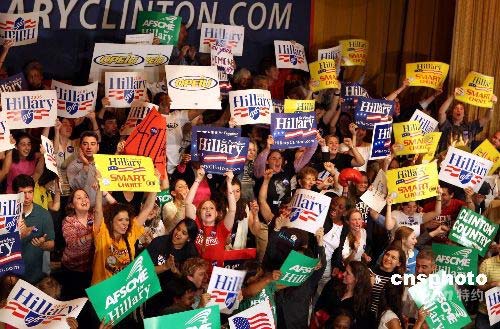前美國第一夫人希拉里4月22日在賓夕法尼亞州贏得民主黨總統(tǒng)侯選人提名戰(zhàn)的一場關(guān)鍵性勝利。圖為希拉里的支持者在費城舉行的慶功會上歡呼慶祝。中新社發(fā) 李靜 攝