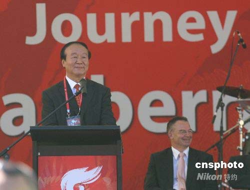 4月24日中午11時(shí)35分,北京奧運(yùn)圣火在澳大利亞首都堪培拉的傳遞順利結(jié)束。北京奧運(yùn)圣火在堪培拉的傳遞從和解廣場開始后,途經(jīng)戰(zhàn)爭紀(jì)念館、高等法院、國家圖書館、國會(huì)大廈等地,最終于中午12時(shí)左右在聯(lián)邦公園點(diǎn)燃圣火盆并舉行慶典儀式?芭嗬瓊鬟f路線全長約15公里,80位火炬手,平均每人傳遞190米左右。圖為北京奧組委執(zhí)行副主席蔣效愚(左)在慶典儀式上致辭。