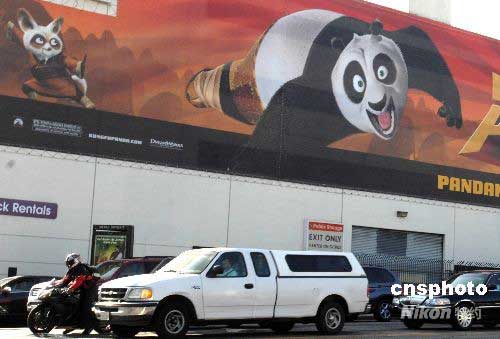 五月初,洛杉磯街頭出現(xiàn)動(dòng)畫片《功夫熊貓》的大型宣傳廣告。由“夢(mèng)工場(chǎng)”出品的好萊塢武打動(dòng)畫片《功夫熊貓》將于六月六日在北美首映。該片中國(guó)味十足,杰克·布萊克、達(dá)斯汀·霍夫曼、成龍等著名影星擔(dān)綱英文版配音。制片商希望該片能成為《史萊克》系列之后的又一部締造票房奇跡的動(dòng)畫片。中新社發(fā) 張煒 攝