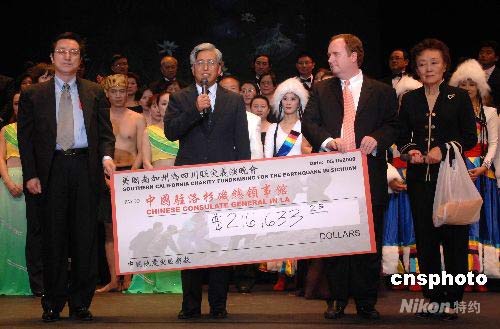 當(dāng)?shù)貢r間五月十五日晚,南加州華僑華人在洛杉磯縣圣蓋博市舉行為四川地震災(zāi)區(qū)賑災(zāi)義演晚會,當(dāng)?shù)厝A僑華人、社團(tuán)、企業(yè)和留學(xué)生等當(dāng)場為災(zāi)區(qū)捐款二十一萬多美元。圖為中國駐洛杉磯總領(lǐng)事張?jiān)?前左二)表示,總領(lǐng)館將盡快把善款轉(zhuǎn)交給地震災(zāi)區(qū)。中新社發(fā) 張煒 攝
