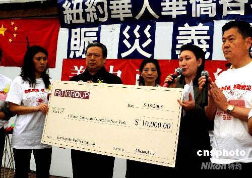 當(dāng)?shù)貢r間5月18日,紐約華人華僑舉辦賑災(zāi)義演,200多名華裔演藝人員冒雨獻藝,現(xiàn)場捐款。中國駐紐約總領(lǐng)事彭克玉(左二),當(dāng)天到賑災(zāi)義演現(xiàn)場等多個募捐點,向義工和捐款者表示慰問與感謝。中新社發(fā) 龔文謨 攝
