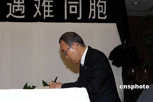 5月19日,聯(lián)合國秘書長(zhǎng)潘基文來到中國常駐聯(lián)合國代表團(tuán),向四川大地震遇難者表示哀悼。潘基文在吊唁簿上用中文寫道:哀悼罹難的中國人民。中新社發(fā) 譚宏偉 攝