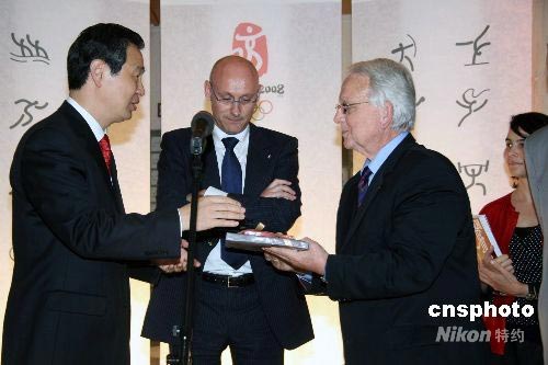 六月十九日晚,法國奧委會在巴黎舉行慶祝北京奧運會迎來倒計時五十天儀式。圖為中國駐法大使孔泉(左一)向法國奧委會主席塞朗杜(左三)贈送法文版新書《二00八北京奧運建筑》。 中新社發(fā) 吳衛(wèi)中 攝
