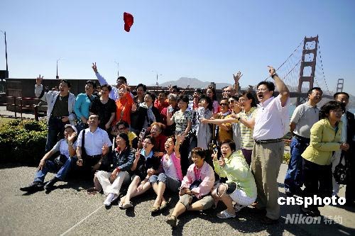 當(dāng)?shù)貢r(shí)間六月二十四日,三十九位來(lái)自中國(guó)上海的中國(guó)公民赴美旅游首發(fā)團(tuán)在舊金山著名地標(biāo)金門(mén)大橋前歡呼雀躍,合影留念。舊金山是該團(tuán)美國(guó)境內(nèi)游的最后一站。中新社發(fā) 陳鋼 攝