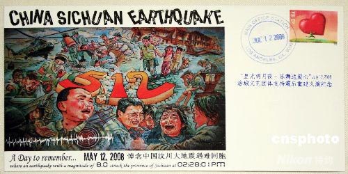 當(dāng)?shù)貢r(shí)間7月12日,美國洛杉磯華人華僑,為紀(jì)念中國四川省汶川縣發(fā)生8級地震,悼念地震遇難同胞,舉辦了“星光明月夜,樂舞送愛心”洛城文藝團(tuán)體支持震后從建紀(jì)念活動(dòng),并發(fā)行首日封一枚。圖為首日封設(shè)計(jì)者魏進(jìn)發(fā)。中新社發(fā) 金立冬 攝