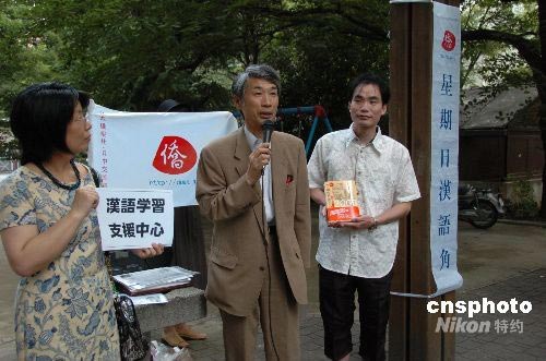 7月13日,在東京舉行的星期日漢語角第48次交流會上,日本僑報社宣布漢語學(xué)習(xí)支援中心正式成立。漢語學(xué)習(xí)支援中心的首個支援項目是,面向研究者的中文讀解力養(yǎng)成講座9月開講,由日本麗澤大學(xué)中文系三瀦正道教授擔(dān)綱,每周一下午5點至7點免費為各大學(xué)的研究生和年輕學(xué)者、漢語學(xué)習(xí)者提供權(quán)威服務(wù)。圖為三瀦正道教授(中)向漢語角參加者介紹漢語學(xué)習(xí)支援中心。中新社發(fā) 段躍中 攝