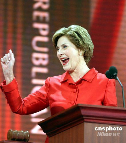 9月2日,美國第一夫人勞拉出席在明尼蘇達州州府圣保羅舉行的共和黨全國代表大會時表示,為阿拉斯加州州長薩拉·佩林有望成為美國歷史上第一位女副總統(tǒng)而感到驕傲。中新社發(fā) 李靜 攝