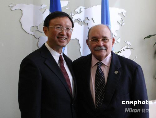 9月22日,中國(guó)外交部長(zhǎng)楊潔篪在紐約聯(lián)合國(guó)總部會(huì)見(jiàn)第63屆聯(lián)合國(guó)大會(huì)主席、前尼加拉瓜外交部長(zhǎng)德斯科托·布羅克曼。中新社發(fā) 李靜 攝