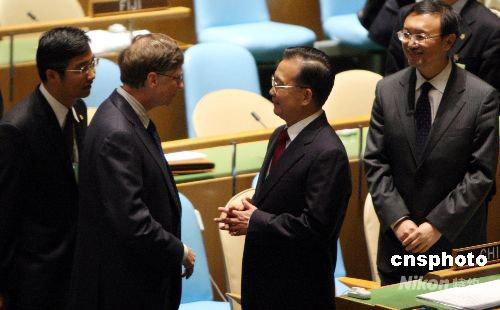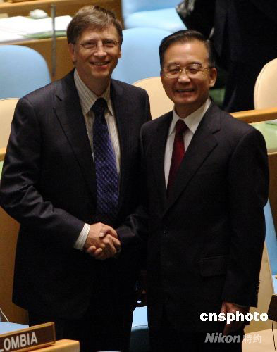 25日,中國總理溫家寶出席聯(lián)合國千年發(fā)展目標(biāo)高級別會議時與前微軟總裁比爾·蓋茨進(jìn)行短暫交談。中新社發(fā) 李靜 攝