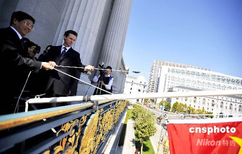 當(dāng)?shù)貢r(shí)間九月二十九日中午,舊金山市長(zhǎng)紐森(左二)和中國(guó)駐舊金山總領(lǐng)事高占生(左一),共同在市政府升起五星紅旗,慶祝中華人民共和國(guó)成立五十九周年。這是舊金山市第十三年為中國(guó)國(guó)慶升旗。同日,市長(zhǎng)紐森宣布十月一日為“中國(guó)國(guó)慶日”和“華裔傳統(tǒng)日”。中新社發(fā) 陳鋼 攝