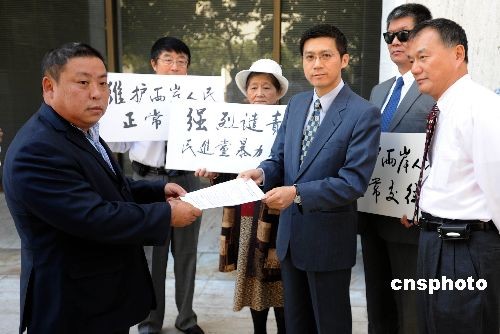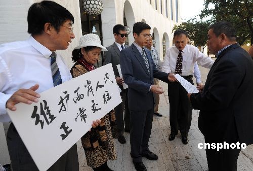 當(dāng)?shù)貢r間十月二十二日,南加州中國和平統(tǒng)一促進會聯(lián)盟主席周德昭將一封抗議信交付“駐洛杉磯臺北經(jīng)濟文化辦事處”代表楊光彬。這份由當(dāng)?shù)囟鄠華人社團聯(lián)名的抗議信稱,大陸海協(xié)會副會長張銘清在臺南遭民進黨極端分子暴力攻擊事件震驚海外華人社會,華人社團嚴厲譴責(zé)極端分子的野蠻暴力行徑,強烈要求馬英九政府嚴懲肇事者。中新社發(fā) 張煒 攝