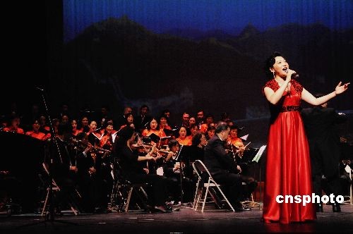 華盛頓黃河藝術(shù)團藝術(shù)家在當?shù)貢r間十月二十五日晚的演出中用中國改革開放歷程中涌現(xiàn)的歌曲,抒發(fā)中國人共同經(jīng)歷的改革開放不平凡的三十年,引起了海外華人強烈共鳴。圖為黃河藝術(shù)團藝術(shù)家演唱《好一個中國大舞臺》贏得雷鳴掌聲。中新社發(fā) 邱江波 攝